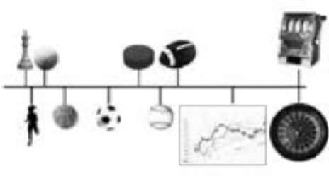 在人们所从事的活动中,“运气”这个因素所占的权重各不相同,但我们可以将他们按权重从0到100%排列起来。根本就没有运气的空间;而在纯粹的赌博类活动(如抛硬币)中,根本就没有技能的空间,运气的权重占100%;在两个极端的中间,是各种技能和运气成分不同的“光谱”(例如打篮球,虽然技能很重要,但偏偏运气不好,看似已经投中的球在蓝筐上颠了几下,最后竟然弹出来了)。